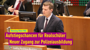 Die Landesregierung hat einen Modellversuch vorgestellt, mit dem Schülern mit mittleren Bildungsabschlüssen der Weg zur Polizeiausbildung geebnet werden soll. „Der FDP ist es ein wichtiges Anliegen, Aufstiegschancen zu ermöglichen. Wieso sollte ein Realschüler nicht ein toller Polizist werden“, fragt Henning Höne, Landtagsabgeordneter aus Coesfeld.